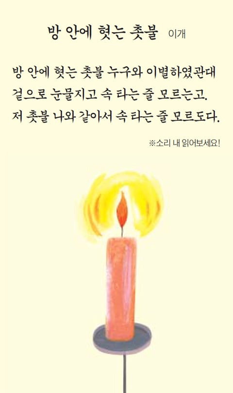 '방 안에 혓는 촛불'은 이개가 단종을 그리워하며 지은 시조입니다. 세조가 어린 조카 단종에게서 왕위를 빼앗았을 때, 신하 이개는 그 과정을 바라보며 눈물을 흘리는 것밖에는 아무것도 할 수 없었습니다. 이개는 겉으로 촛농이 흐르고 속으로는 심지가 타들어 가는 촛불의 모습을 자신의 슬픈 마음에 비유했습니다. 어린 왕을 생각하며 눈물짓고 애태우는 심정이 절절하게 드러납니다.