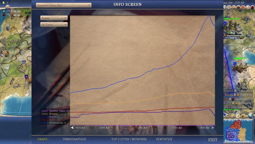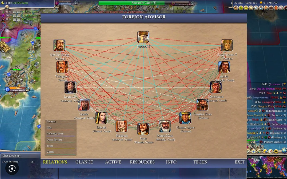위 사진은 전쟁이 많고 종속국도 얽히고 설켰네요. 문명4를 오래하지 않아도 한 눈에 봐도 알 수 있습니다.