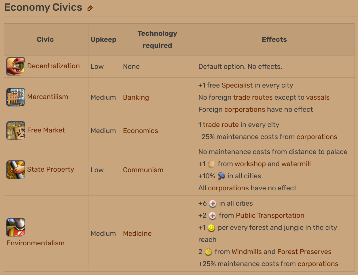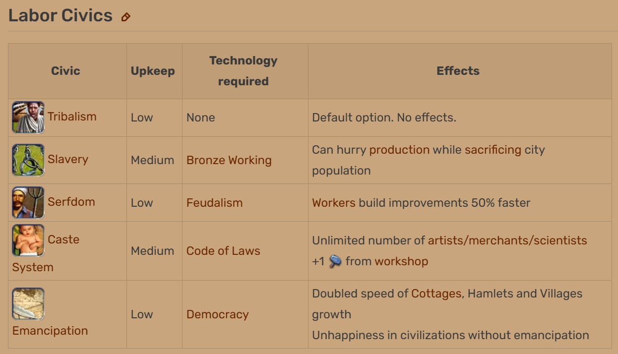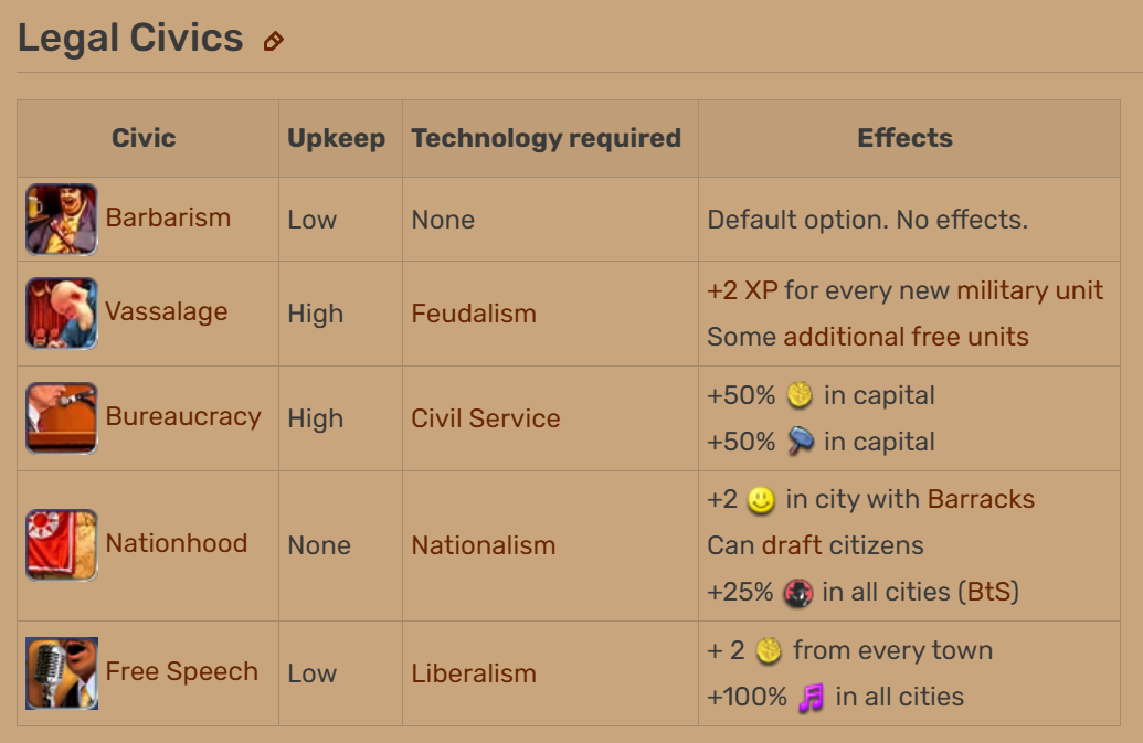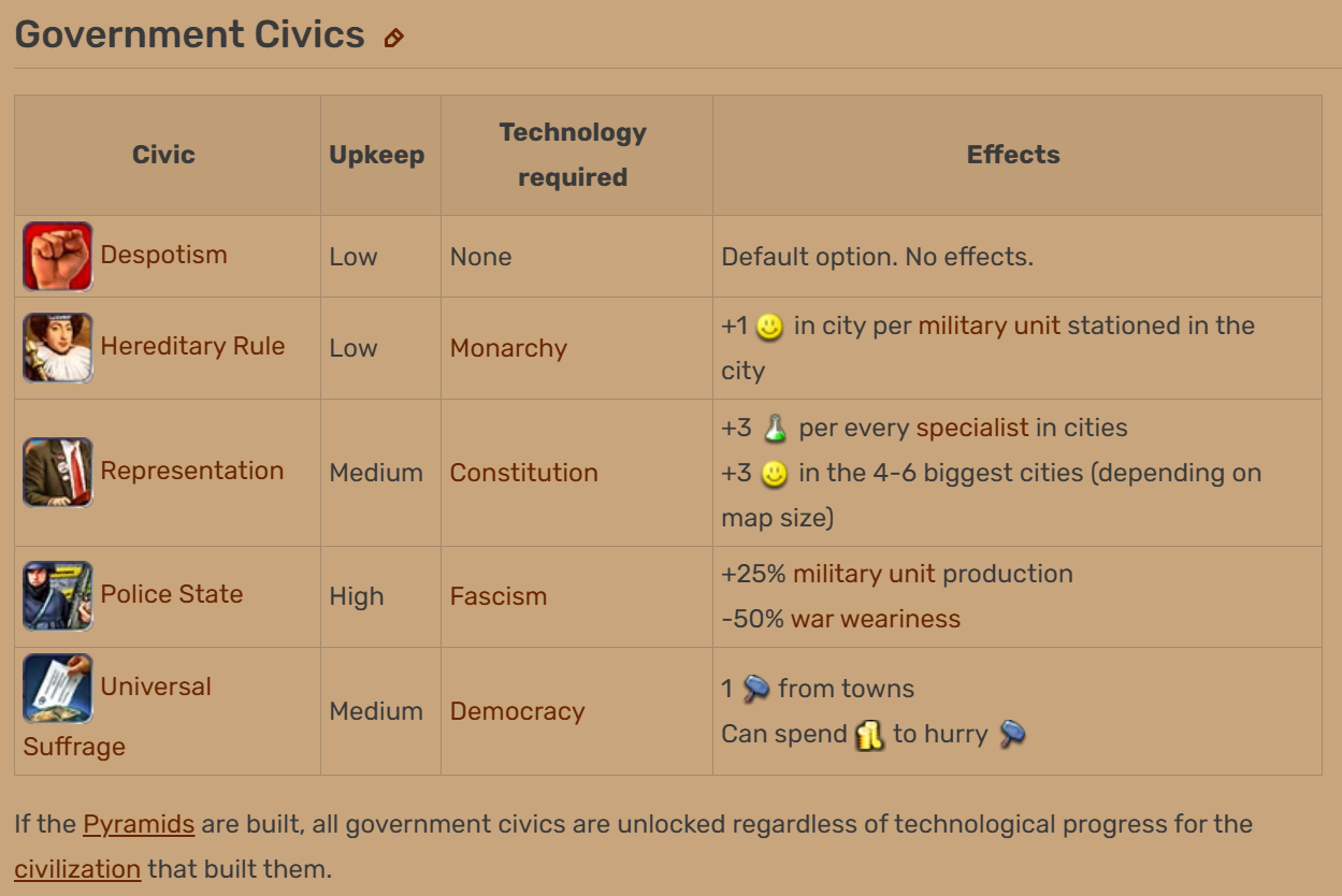 보통선거제, 경찰국가, 간접민주제, 국가주의, 카스트제, 농노제, 노예제, 봉건제 등등 F3을 누르시면 사회제도 창이 보입니다. 주로 1~2개 변경 시에는 무정부상태(아나키)가 1턴이며 3~4개 변경 시에는 무정부상태가 2턴입니다. 피라미드 건물이 있거나 우아이나 카팍 지도자 같은 경우에는 무정부상태 없이 변경도 가능합니다. 자신 문명의 도시 상황과 여러 가지 고려 사항을 고려해 보고 맞는 사회제도를 채택하시면 되시겠습니다. 무엇을 채택해야 하는 것인지에 대해서는 상황마다 다양하게 다릅니다. 예를 들어, 중세의 정석은 세습통치(Hereditary Rule) + 관료제(Bureaucracy) + 노예제(Slavery) + 조직화된 종교(Organized Religion)이며, 위인과 전문가 중심이라면 간접민주제(Representation) + 카스트제(Caste System) + 중상주의(Mercantilism) + 평화주의(Pacifism), 망치(생산력) 중심 플레이라면 카스트제(Caste System) + 국유화(State Property) + 신권정치(Theocracy), 오두막 중심 플레이라면 보통선거제(Universal Suffrage) + 언론자유(Free Speech) + 노예해방(Emancipation) + 종교의 자유(Free Religion)를 채택하면 됩니다. 각 사회제도마다 유지비용이 다르며, 이 유지비용으로 인해서 기술 개발할 때 수 턴 차이가 나게 되며, 이 수 턴의 차이가 수 십개의 기술개발로 이어진다면, 이 또한 스노우 볼링이 굴러갈 수 있습니다.