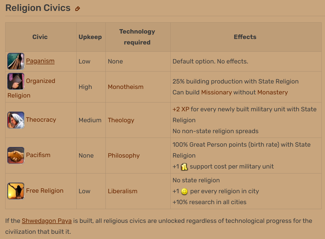 문명4에서 종교는 중요한 요소로 여겨지기도 합니다. 특히, 초반에 종교를 만들거나 국교로 채택해서 행복도를 증가시키게 되며 외교라인 또한 같은 종교끼리 이루어지기도 하죠. 같은 종교를 가진 문명끼리 전쟁하면 "같은 신앙을 믿는 형제끼리 싸움을 멈춥시다"라며 교황청에서 평화 사주를 하기도 합니다. 같은 종교를 믿는 문명끼리 연합해서 다른 종교를 믿는 문명과 전쟁을 하기도 하죠. 국교를 채택하면 행복도+1이 되며 같은 국교를 가진 국가들 간에 우호도 증진, 시빅에 따른 혜택(건물속도+25%, 유닛경험치+2)가 됩니다. 또한 후반기 가면 신앙의 자유를 채택할 수도 있는데 국교가 사라지며 종교 건물도 쇠퇴합니다. 종교로 인한 외교라인도 서서히 옅어지게 되기도 하고요. 대신 종교로 인해 생긴 외교라인에서 자유로울 수 있습니다.