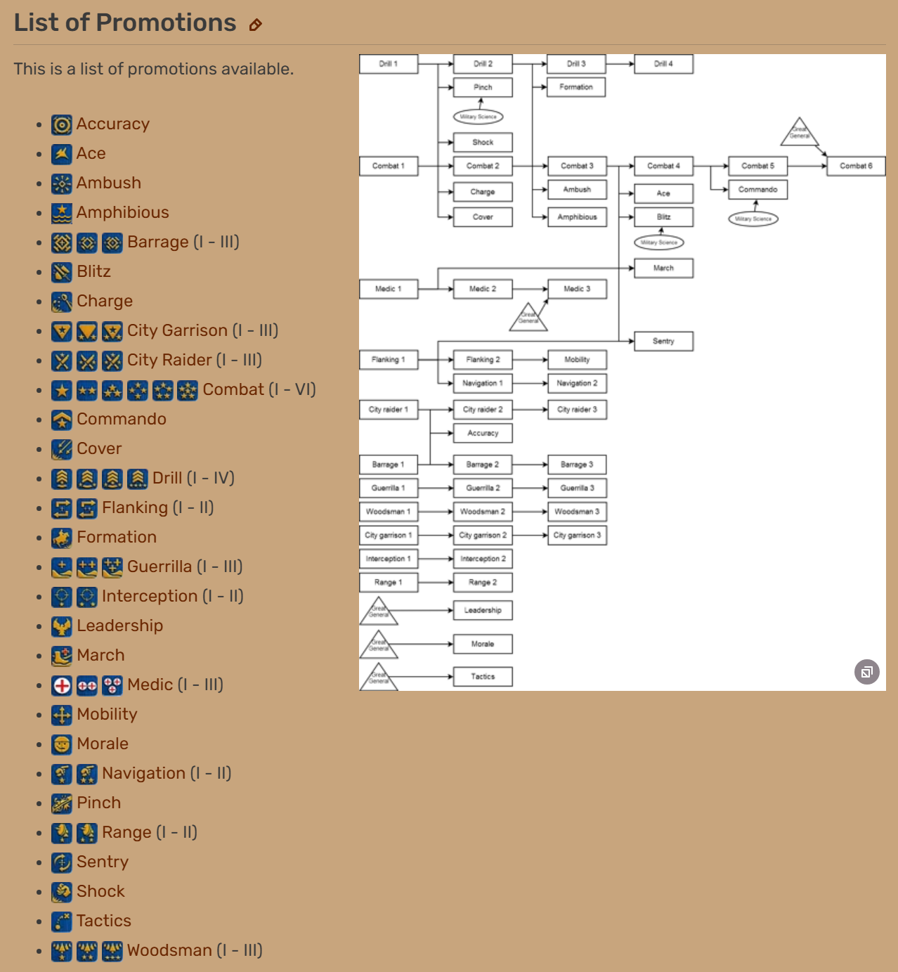 저의 경우에는 인근 문명의 군사 상황을 보고 기다리거나 준비합니다. 아니면 방어를 준비하기도 하고요. 고수분들 같은 경우에는 전쟁을 준비할 때 100턴정도 군사유닛만 뽑기도 합니다. 전 트레뷰체트, 캐논, 자주포 같은 공성유닛을 70% 이상 구성하고 탱크같은 기갑유닛은 20% 정도로 많이 섞진 않습니다. 상대 문명에 공군 유닛 있으면 SAM 유닛과 같은 지대공 군사 유닛 5개 내외로 구성해도 충분히 막아지더군요. 기병대나 건쉽 같은 유닛으로 게릴라 노리기도 하고요. 현대전차 같은 경우에는 대전차병이나 건쉽있으면 쉽게 막아지는데, 기계화보병은 막기가 쉽지 않습니다. 오히려 망치 소모가 많이 되는 현대전차보다 망치가 덜 들며 대전차병, 건쉽과 같이 카운터가 없는 기계화보병이 꽤 괜찮은 유닛으로 통합니다. 전쟁은 자신만의 스타일대로 하시면 됩니다. 사실 그냥 겹쳐서 싸우기 때문에 스타일대로 싸우기보다는 병력을 어떻게 구성하느냐가 자신의 스타일이 되죠. 참고로, 선전포고할 때 국경개방은 끊으시고 하셔야 나중에 우호도에서 마이너스가 덜 찍힙니다. 전쟁 진행은, 겹쳐서 가는 것이 제일 유리하며 시간적 여유가 있으면 도시 앞에 요새화해서 25% 보너스를 받고 공격하는 것이 더 좋습니다. 그리고 공성유닛으로 도시방어를 0%까지 낮춘 다음 공격하거나 도시공격이나 2차 피해 증가로 진급시켜놓고 공격하면 원활합니다. 보통은 퇴각 기회 50%면 살기 어렵다고 봐야 하며 처음에는 던지는 것 같아도 계속 공격하다 보면 2차 피해로 인해 상대 도시의 유닛들이 피가 많이 깎여 있습니다. 그럴 때 탱크나 현대전차 등등 기갑 유닛으로 공격하는 것이 제일 일반적이고 효과와 효율이 좋습니다. 기사나 기병대와 같은 기마 유닛은 도시점령은 할 수 있으나 방어 보너스가 없습니다. 그래서 도시를 방어시킬 때 요새화 보너스가 없어서 기마 유닛으로 방어시키는 것은 추천드리지 않습니다. 다만, 급하게 도시에 군사 유닛이 아무도 없을 경우 불행지수가 굉장히 높기 때문에, 이를 막는 용도로 잠시 가져다 놓는 것도 괜찮습니다. 건쉽 같은 유닛도 마찬가지인데, 기마 유닛과 다르게 건쉽은 도시 점령이 안됩니다. 일반적인 전투에서는 강을 건너가서 공격하면 전투력 –마이너스가 되며, 아래에서 언덕 위를 공격해도 –마이너스가 됩니다. 노동자로 요새를 지은 타일에서 요새화를 하면 전투력 방어 보너스가 있기도 합니다. 도시를 점령하게 되면, 도시의 생산 목록 중 내가 원하는대로 생산하게 하는데 일정한 턴 수가 걸립니다. 군사력 숫자가 높을수록, 그 걸리는 턴 수가 줄어들게 됩니다. 기마병, 건쉽 등의 기마 유닛, 게릴라 유닛은 해당 없습니다. 또 전쟁을 걸려는 상대 문명의 도시들(공격 루트)과 포함하고 있는 군사 유닛들을 보고 내 군사 유닛들과 비교하다 보면, 이 전쟁이 내가 승리할만한 전쟁인지, 그렇지 않은 전쟁인지 각이 나옵니다. 이길만한 각이어도, 상대 문명이 어느 문명에 종속되어 있는지, 방위조약 체결 중인지, 다 되어있다고 하더라도 감당이 가능한 전쟁인지도 각을 잡아야 하죠. 이건 문명4를 오래 하다 보면 생기는 감인데요, 너무 부담스러운 전쟁이다 싶으면 같이 전쟁에 참여하자고 다른 문명에게 요청할 수도 있습니다. 아래 사진은 유닛들의 진급 목록과 루트입니다.