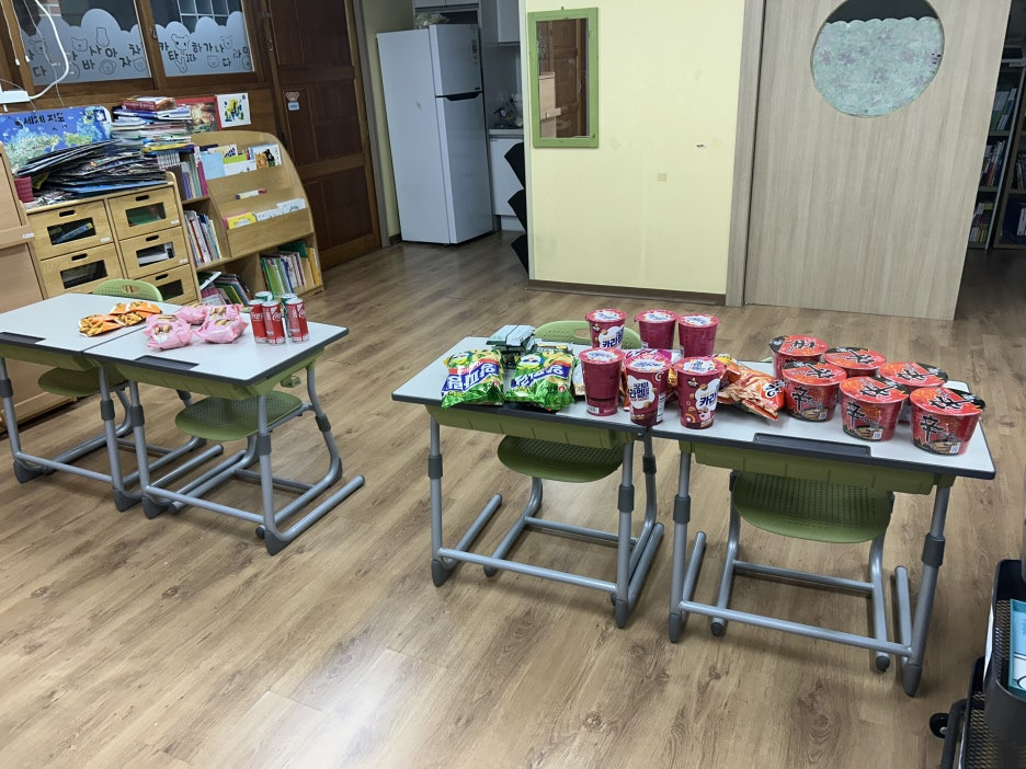 물론 강제는 아니고 계산만 하고 먹고 싶은 사람만 먹기로 했는데 컵라면, 콜라, 과자, 치즈, 감자튀김 등이 있었다. 그 중에서도 특히 감자튀김이 곤혹스러웠던 기억이 있는데, 아침 1~2교시에 진행될 공개수업에 감자튀김을 굽고 있을 여유가 없다. 교장선생님, 교감선생님이 앉아 계실 의자도 구비해야 하며 책상, 의자 또한 설계된 수업에 맞게끔 위치하여야 하고, 계산기 교구 또한 가져다 놓고 학생들에게도 아직 음식을 먹으면 안된다는 말도 해야하고 등등 공개수업 전에는 원래 이것 저것 많이 바쁘다. 감자튀김 따위 요리하고 있을 시간이 없다. 그래서 전날 미리 튀기고 냉장고에 넣어둔 후 당일 날 전자레인지에 데우는 방식을 구상했다.