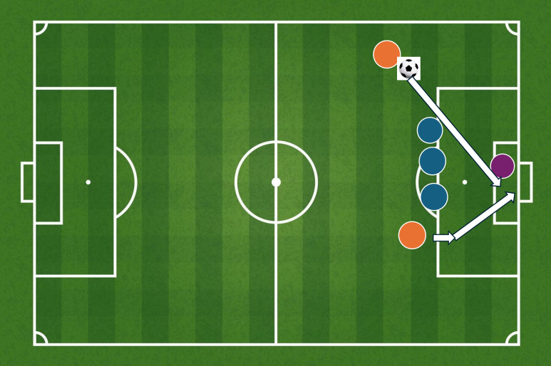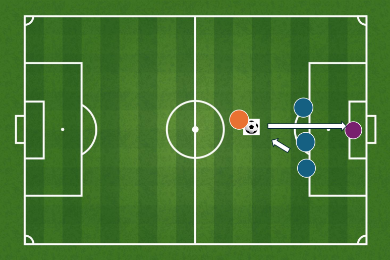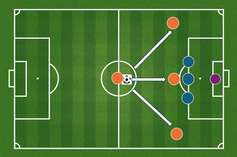 윙에게 보내면 외각으로 한 번의 패스를 더 거쳐서 가는 것이기 때문에 우리편 입장에서는 수비하기가 한결 수월해집니다.