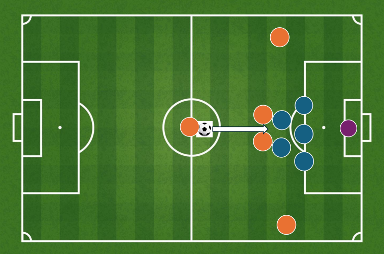 한 명의 수비 양 옆에 두 명의 상대방 공격수가 있기 때문에, 패스를 줄 수 있는 각도가 상대방에게 매우 유리합니다.