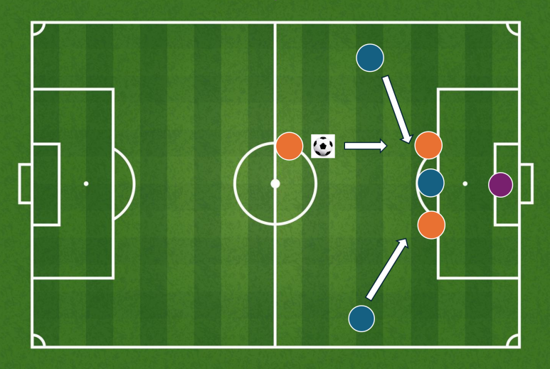 수비시에는 2명의 수비수가 그림과 같이 혼자있는 수비수에게 최대한 빨리 가서 수비에 가담해야만 합니다.