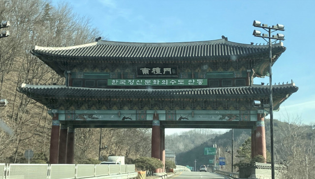 안동에 들어가거나 나올 때, '한국 정신문화의 수도'라고 쓰인 전통적인 문이 있습니다.